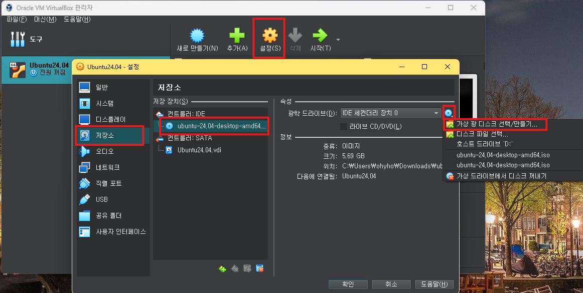 하나의 가상 머신 환경을 만들었으면, 설정에 들어가 가상 광학 디스크를 추가해야한다.