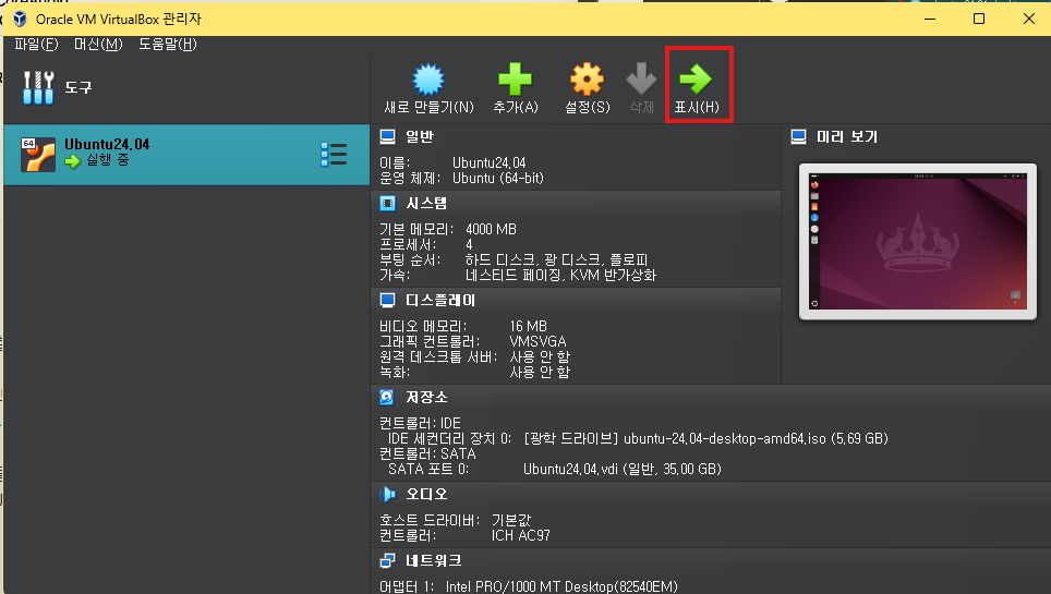 화살표 버튼을 눌러, 가상 머신을 실행하여 Ubuntu를 설치한다.