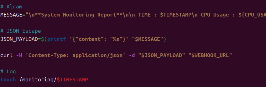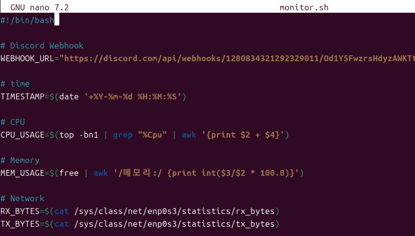 `crontab`으로, 매 1분마다 측정된 `CPU 사용량`, `메모리 사용량`, `네트워크 사용량`을 `Discord 웹 훅`을 사용하여, Discord로 보내도록 스크립트를 만들 것이다.