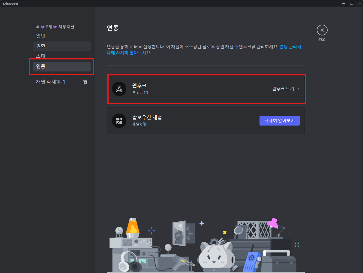 3. `연동` 카테고리에 들어가, `웹후크`를 클릭한다.
