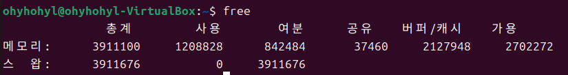 `free` 명령어를 통해, 전체 메모리(사용하는 메모리, 남은 메모리, 버퍼 메모리)에 대한 상태를 확인한다.