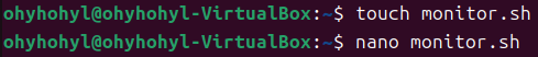 우선 `touch` 명령어로 `monitor.sh`라는 파일을 생성한 후, `nano` 명령어로 파일 편집기를 연다.