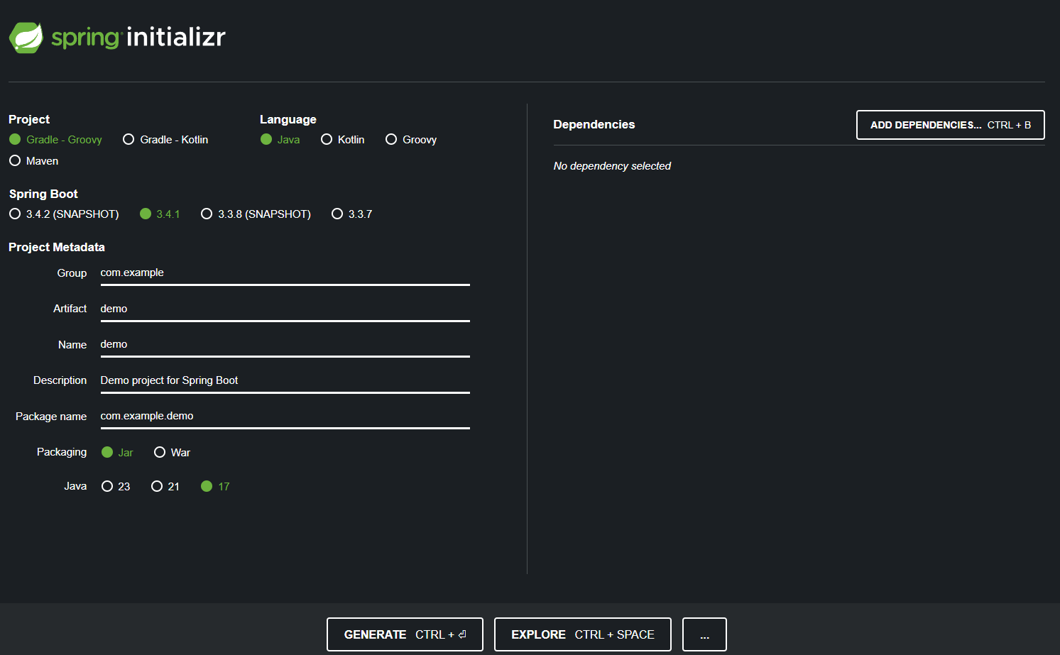 스프링부트 스타터(https://start.spring.io/)에 들어간다.