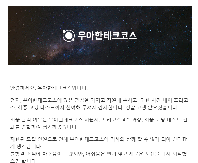 우테코 지원은 백엔드로 방향을 바꾸는 큰 의미였고, 프리코스하며 다른 분들에게 좋은 부분을 배우며 많이 성장하고, 최종 코딩 테스트를 통해 자만했던 나 자신을 다시 돌아보게 되었다.