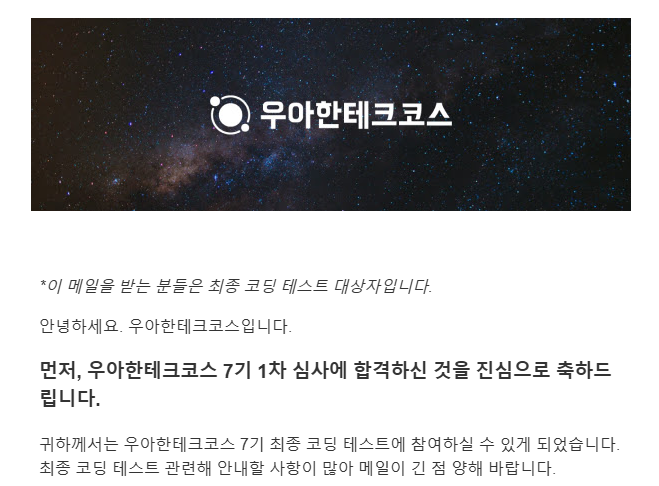 그리고 한 달가량의 기간 뒤에 12월 9일 월요일에 1차 합격자 발표가 나오고, 5일 뒤인 12월 14일 토요일에 바로 최종 코딩 테스트가 있다.