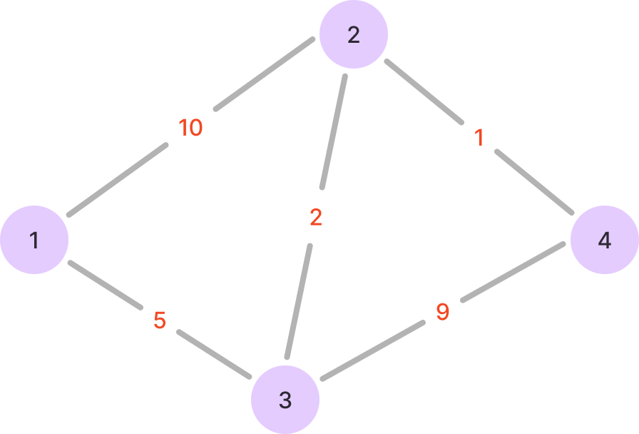 road : [[1, 2, 10], [1, 3, 5], [3, 2, 2], [3, 4, 9], [2, 4, 1]]